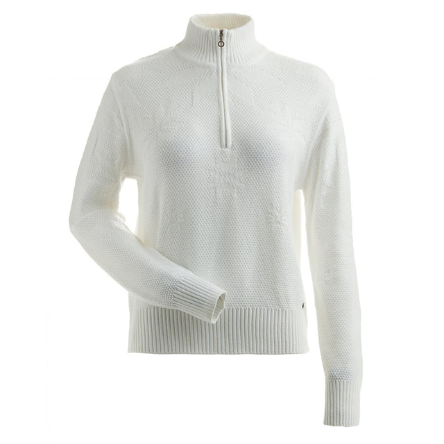 1/4 zip relaxed fit sweater with tone on tone snowflake detail. This single knit sweater will keep you warm on and off the slopes.